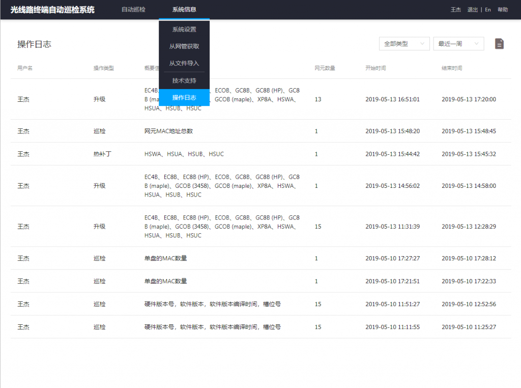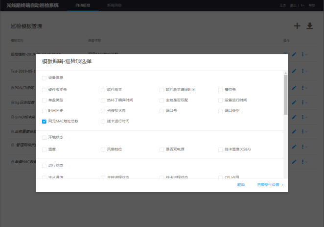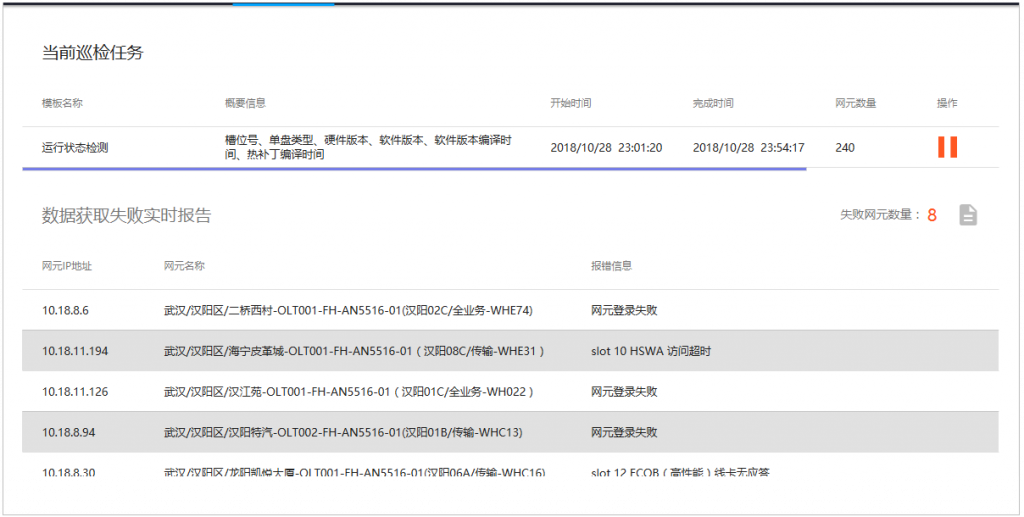 光线路终端自动巡检系统 光线路终端设备是用于连接光纤干线的终端设备。 传统巡检中的大量工作要靠人工手动,效率低、时间久、劳动强度大。因此,有必要为运维人员开发一个提升巡检操作效率,降低人工工时投入,提高人均维护效率的,并将设备运行技术参数信息化、实时监控化的软件工具。 本系统实现了终端设备巡检的自动化。具有巡检覆盖面,任务设置、告警设置、操作日志记录等功能,提高了巡检效率,降低人工劳动强度和精力,使企业节省了人工成本。 以下为系统功能页面展示: