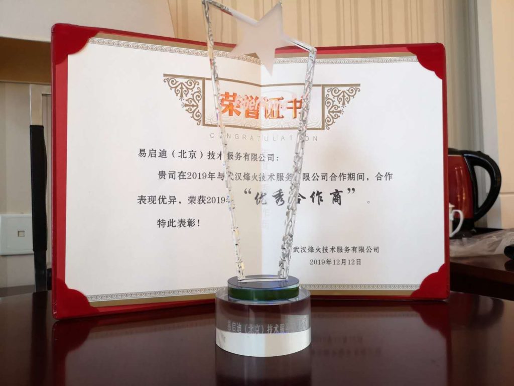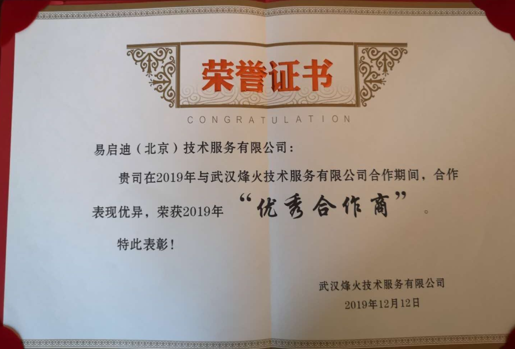 发布于 2021年7月27日2019年12月12日 热烈祝贺易启迪荣获烽火技术服务有限公司2019年“优秀合作商”公司新闻 2019年12月12日,武汉烽火技术服务有限公司合作商大会顺利召开,易启迪(北京)技术服务有限公司荣获2019年“优秀合作商”奖。